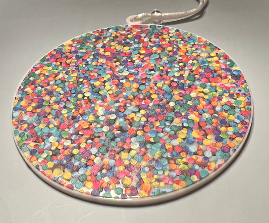 Acrylic Black Yarn Ball Suncatcher/Ornament with multi color dot background