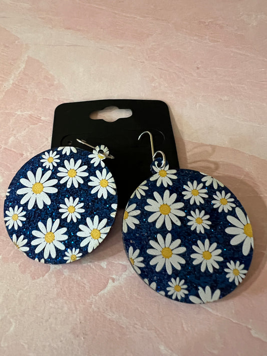 Acrylic Earrings - White Daisies and Blue Glitter on SS wires - A variety of shapes - see item list and photos for selection