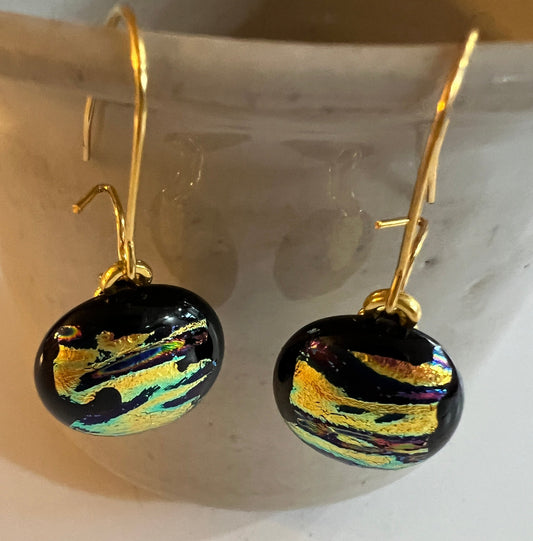 Fused Glass Earrings - gold dichroic on black base with gold filled ear wires