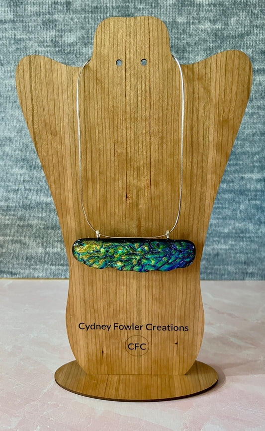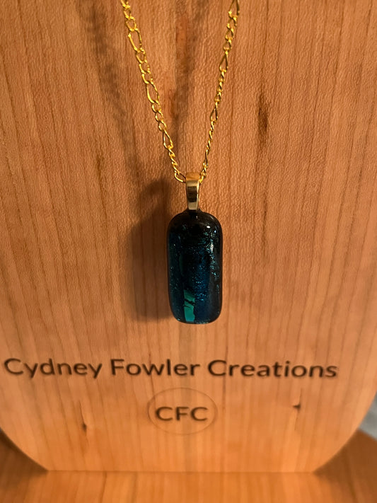 Fused Glass Pendant - blue green dichroic on silver tone bail and chain