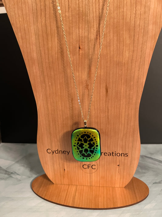 Fused Glass Pendant - Green Dichroic with hand engraving on gold tone chain