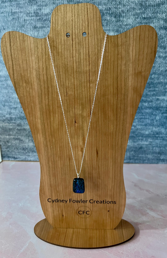 Fused Glass Pendant - blue dichroic on silver tone bail and chain