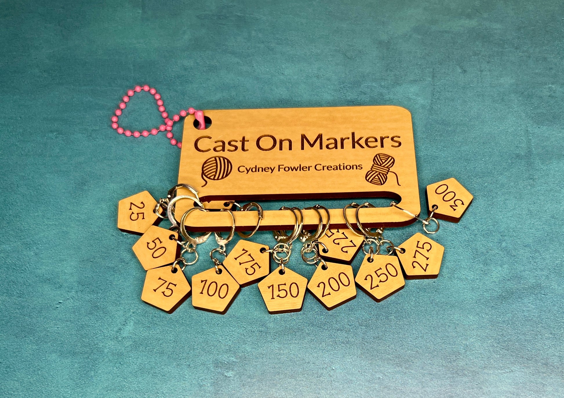 Make your knitting and crochet projects easier with the Cast On Stitch Marker Set designed to help you stay on track. These lever-back markers are labeled in increments of 25 up to 300, reducing the need to repeatedly count your stitches. The faux wood finish offers a warm, natural look, and the compact card-sized holder keeps your markers organized and accessible. Perfect for cast-on stitches in knitting or your beginning chain in crochet, this set supports your crafting process every step of the way. Handy for counting rows as well. Wood colors may vary, adding a personal touch to your tools.